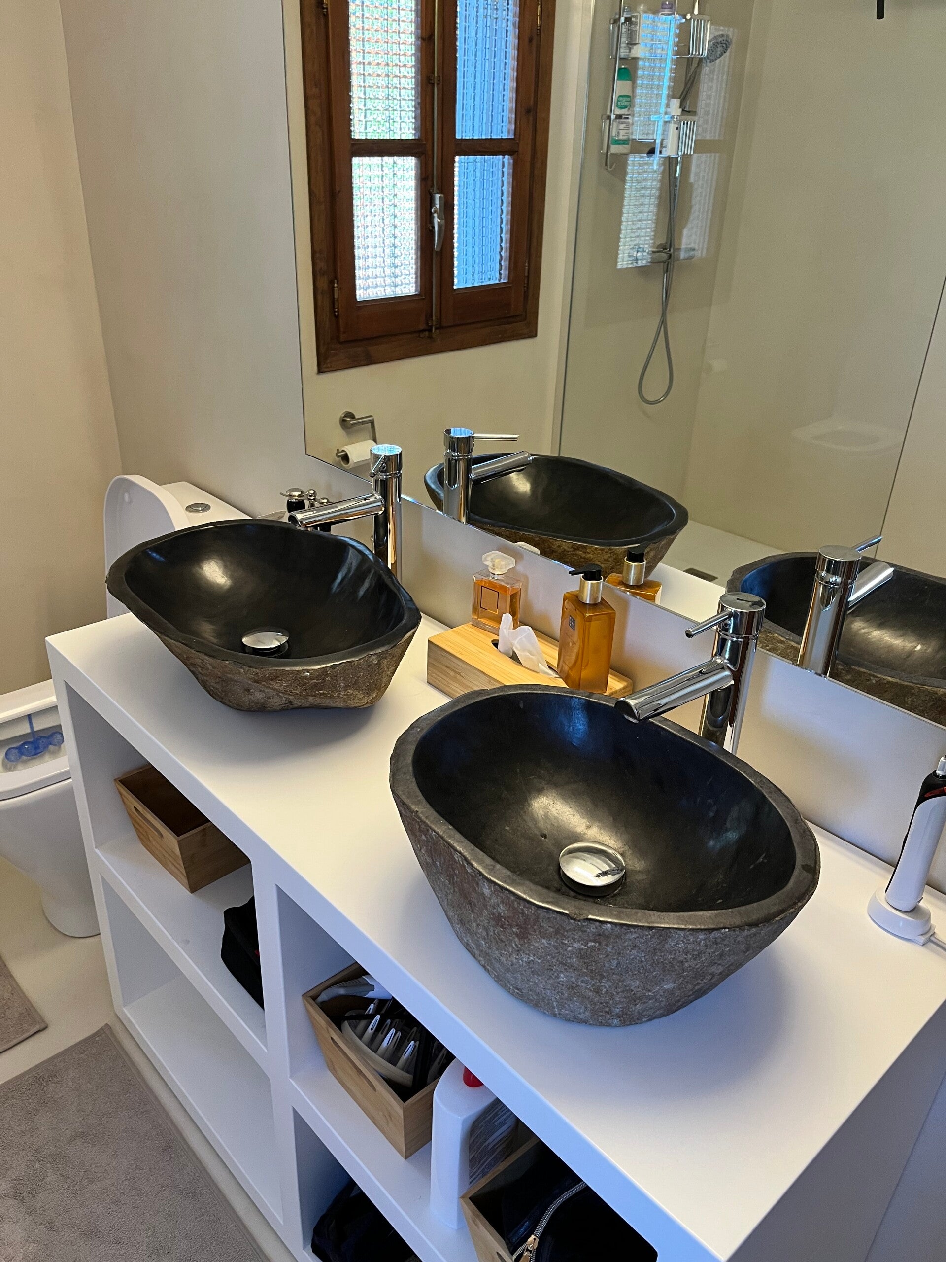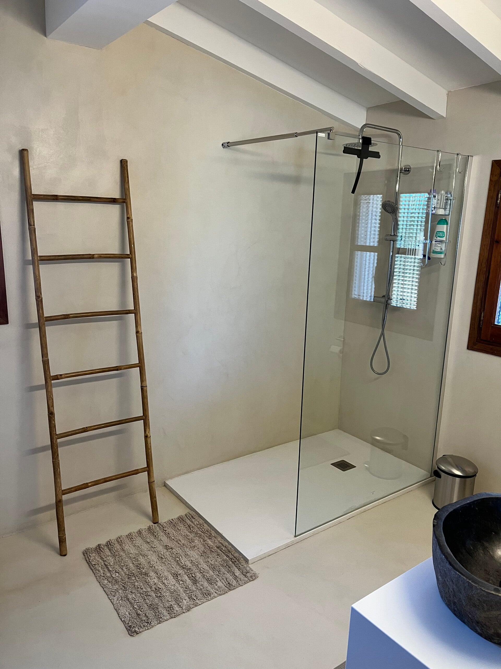 1 RUIME BADKAMER MET INLOOPDOUCHE / TOILET / 2 LAVABO'S EN VERWARMINGSELEMENT