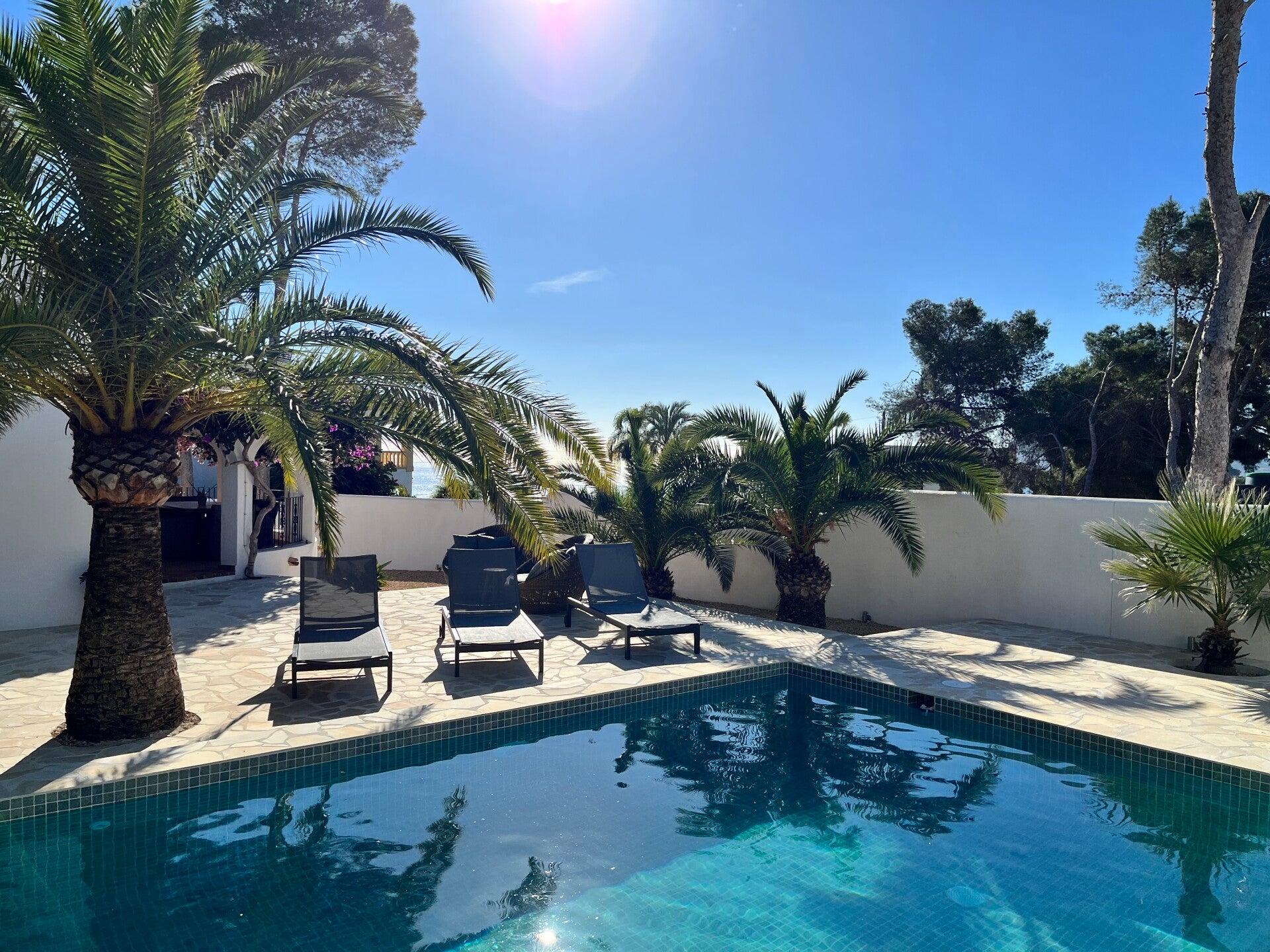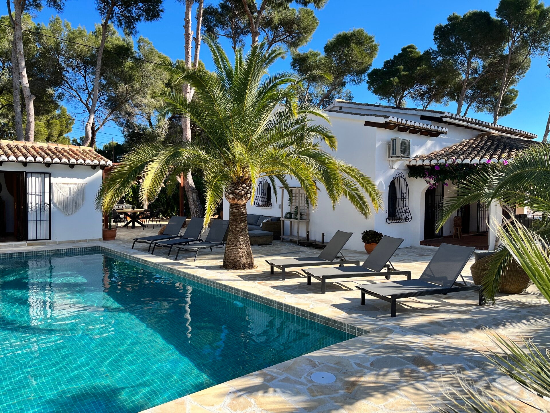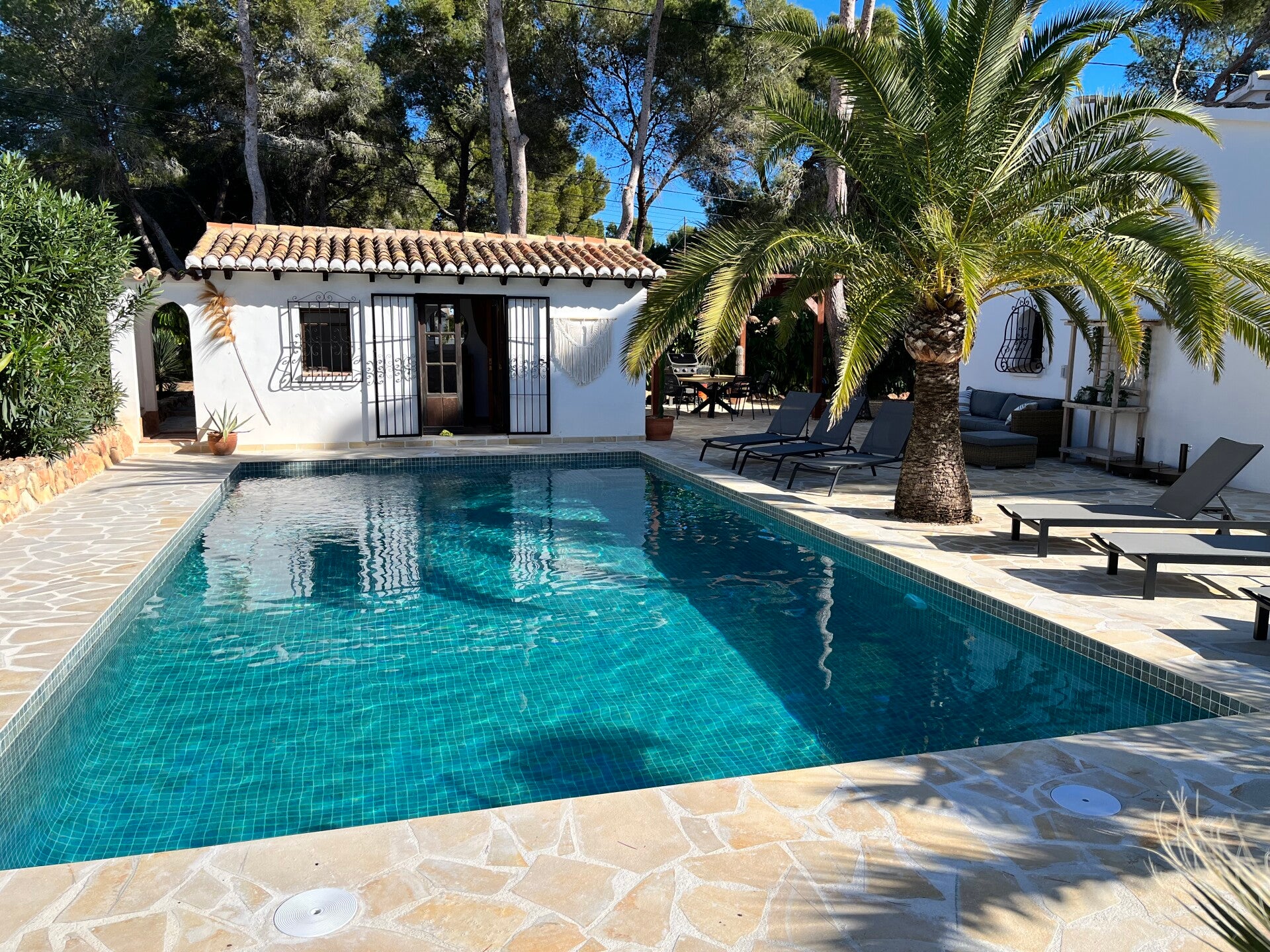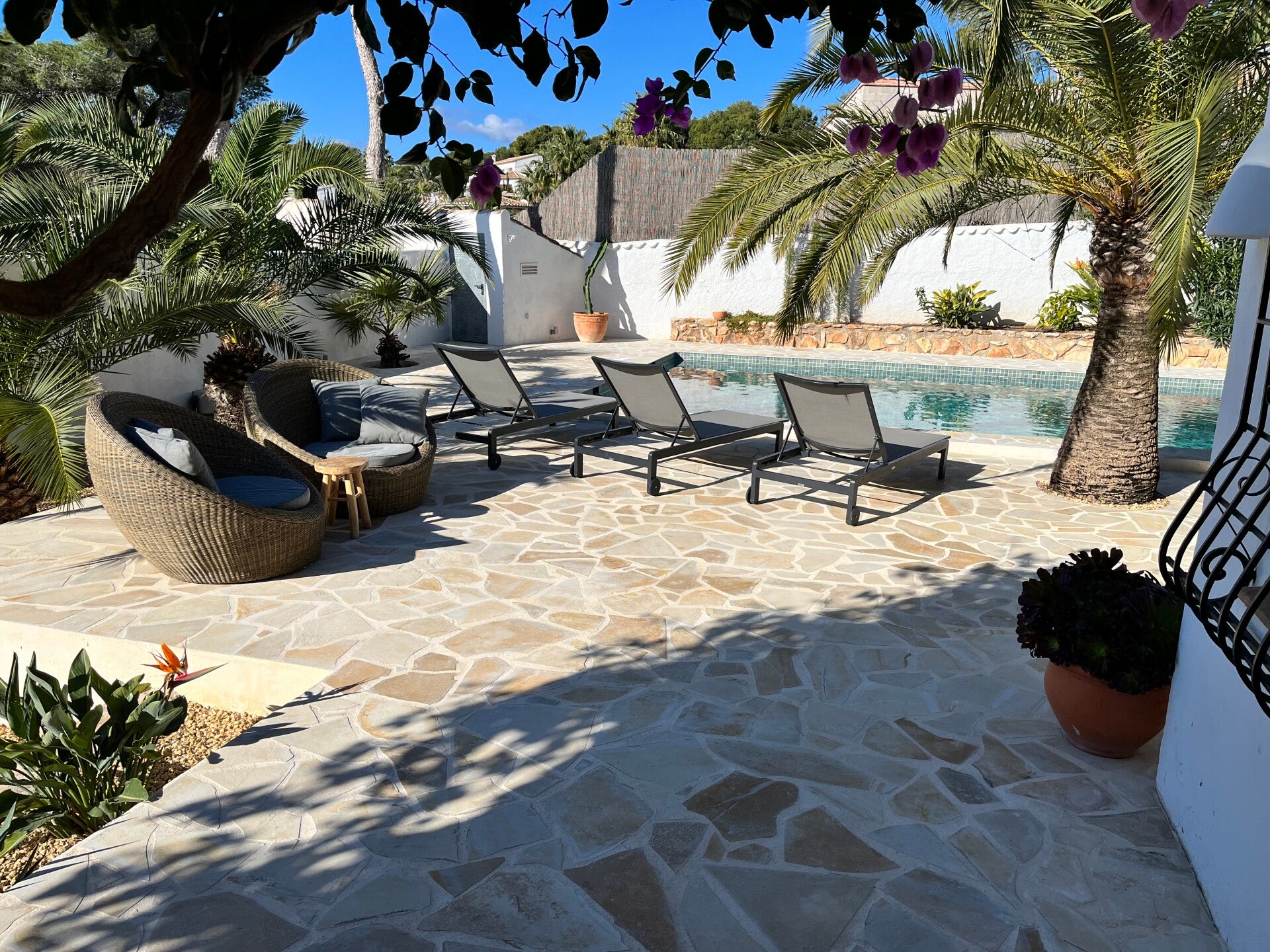 COMFI LIGZETELS RONDOM HET ZWEMBAD EN EEN LEUKE LOUNGEBANK OM HEERLIJK TE RELAXEN.