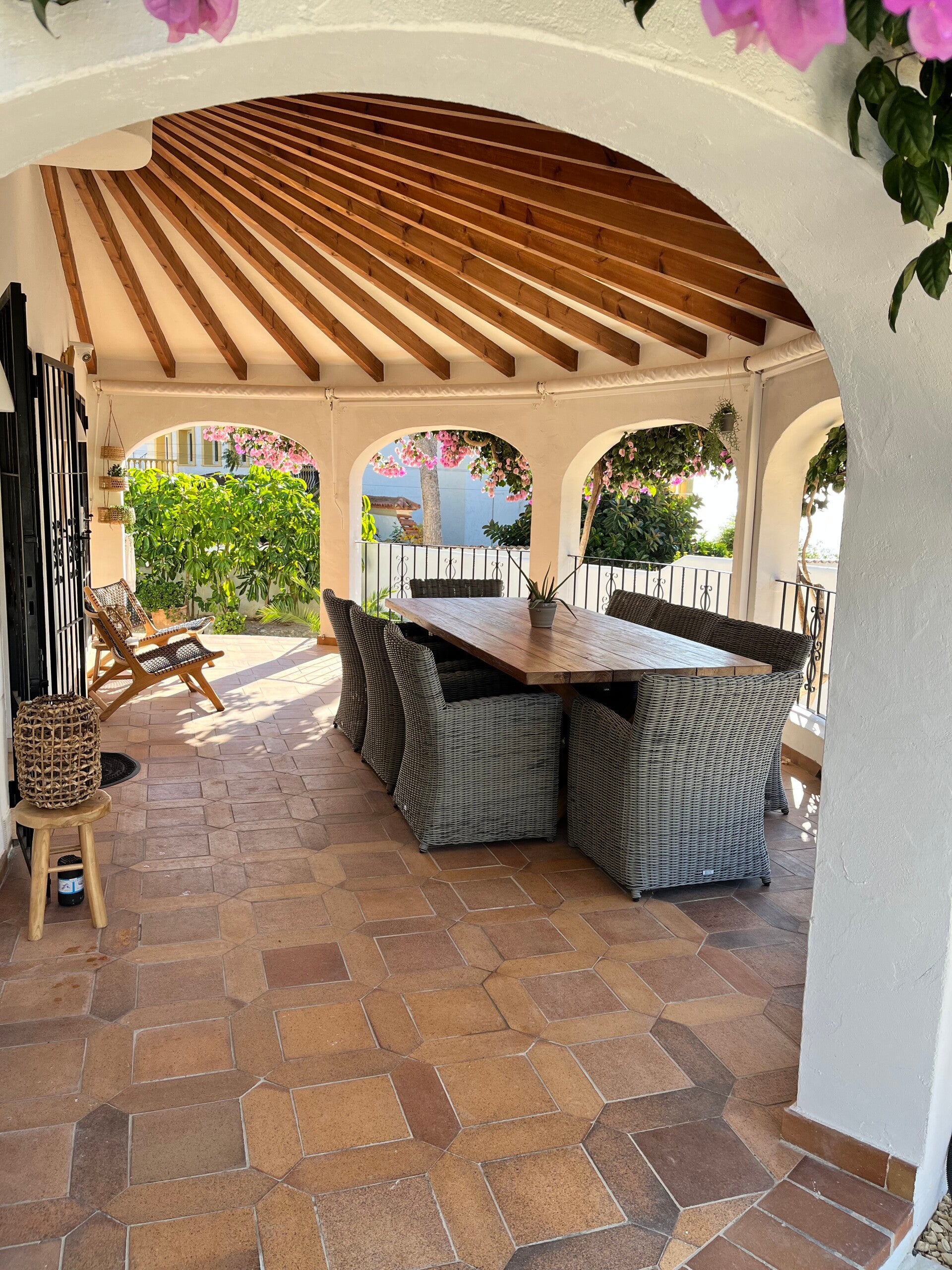 HET IS ZALIG VERTOEVEN IN DE GROTE BUITENRUIMTES RONDOM DE WONING, EEN OVERDEKTE NAYA, DIE BIJNA VOLLEDIG KAN WORDEN AFGESLOTEN, MET MOOIE EETTAFEL WAAR JE ZALIG KAN ONTBIJTEN/LUNCHEN/DINEREN MET ZICHT OP ZEE.
