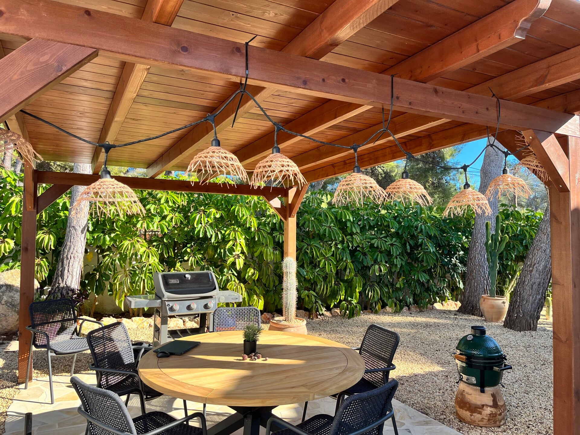 EEN BBQ AREA MET PERGOLA EN TAFEL EN STOELEN