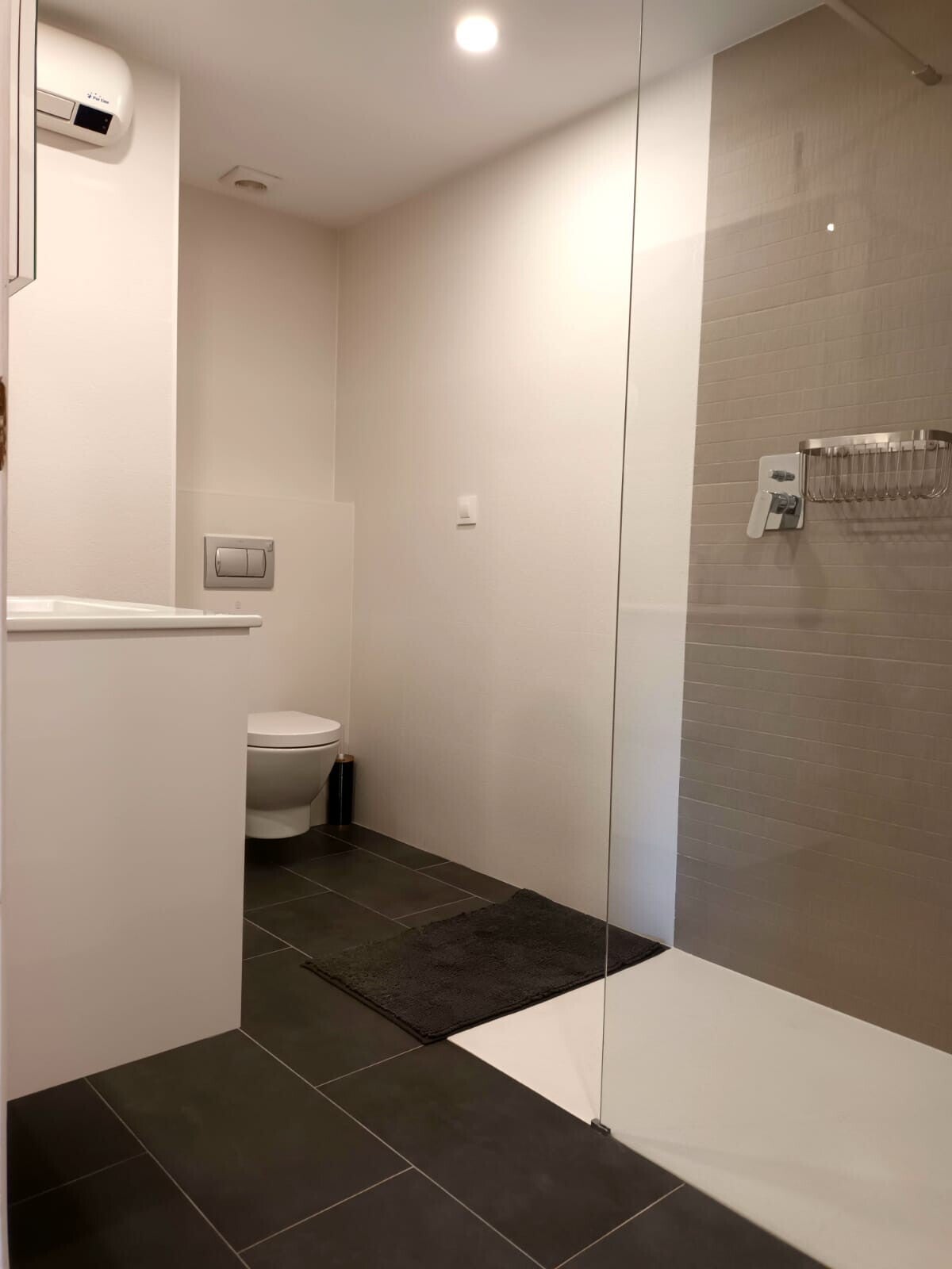 DE BADKAMER IS PAS GERENOVEERD EN HEEFT EEN MOOIE GROTE INLOOPDOUCHE, EEN TOILET EN EEN LAVABO MET BADKAMERMEUBEL